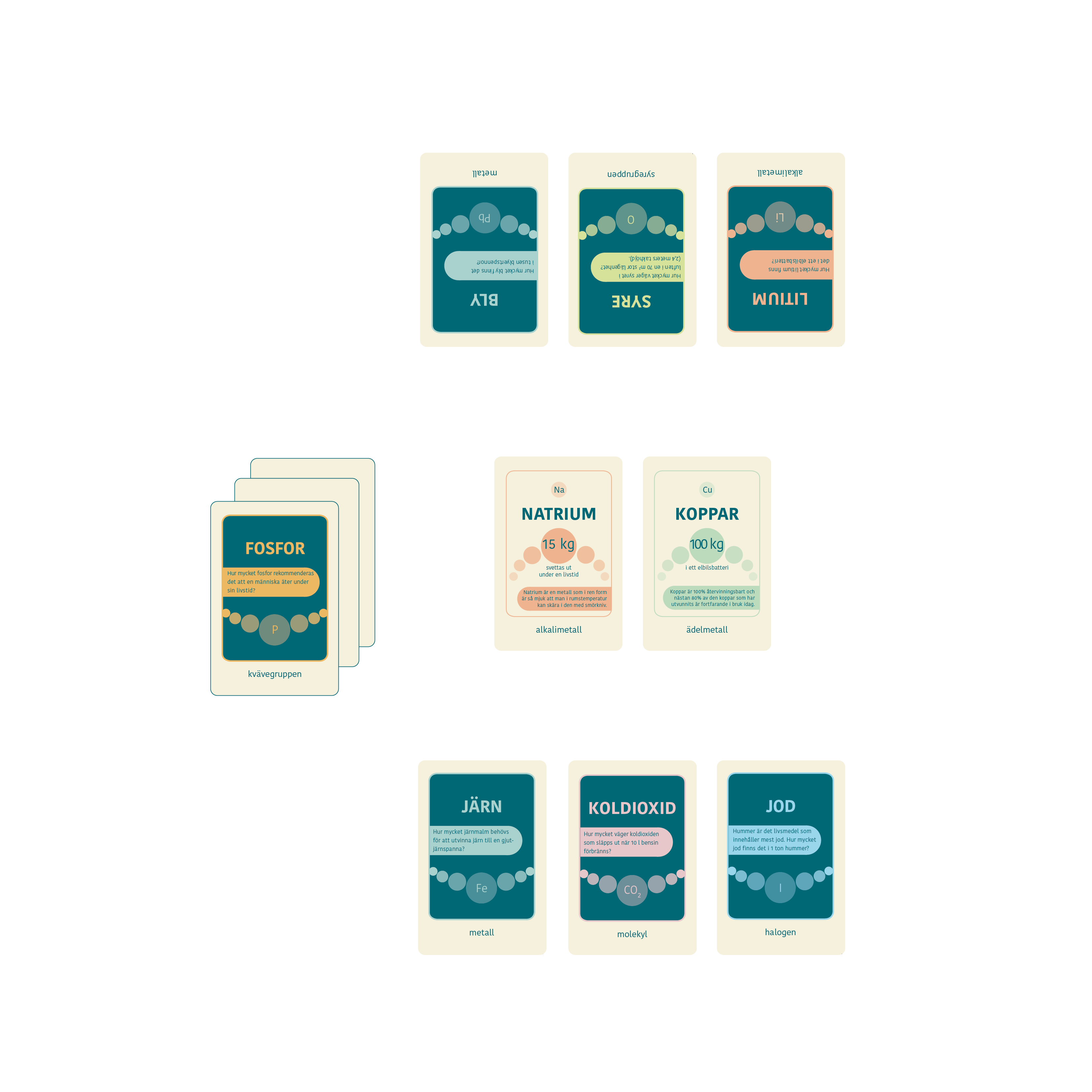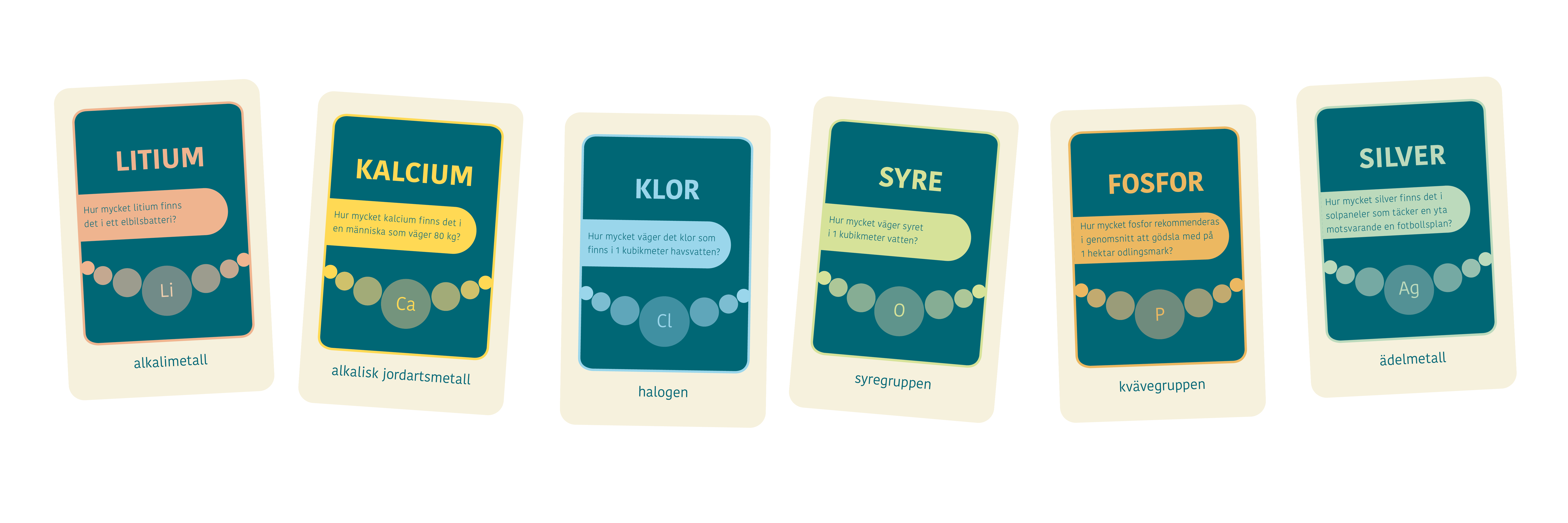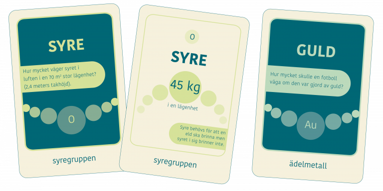 SPELA SÅ HÄR: Dela in eleverna i grupper, med fyra till sex elever i varje grupp. Dela ut en kortlek till varje grupp och låt dem spela i lag mot varandra (med två till tre elever i varje lag). Under spelets gång får eleverna gissa vad som väger mest och försöka placera så många kort som möjligt i rätt storleksordning. Samtidigt får de upptäcka hur kul det kan vara med kemi!
